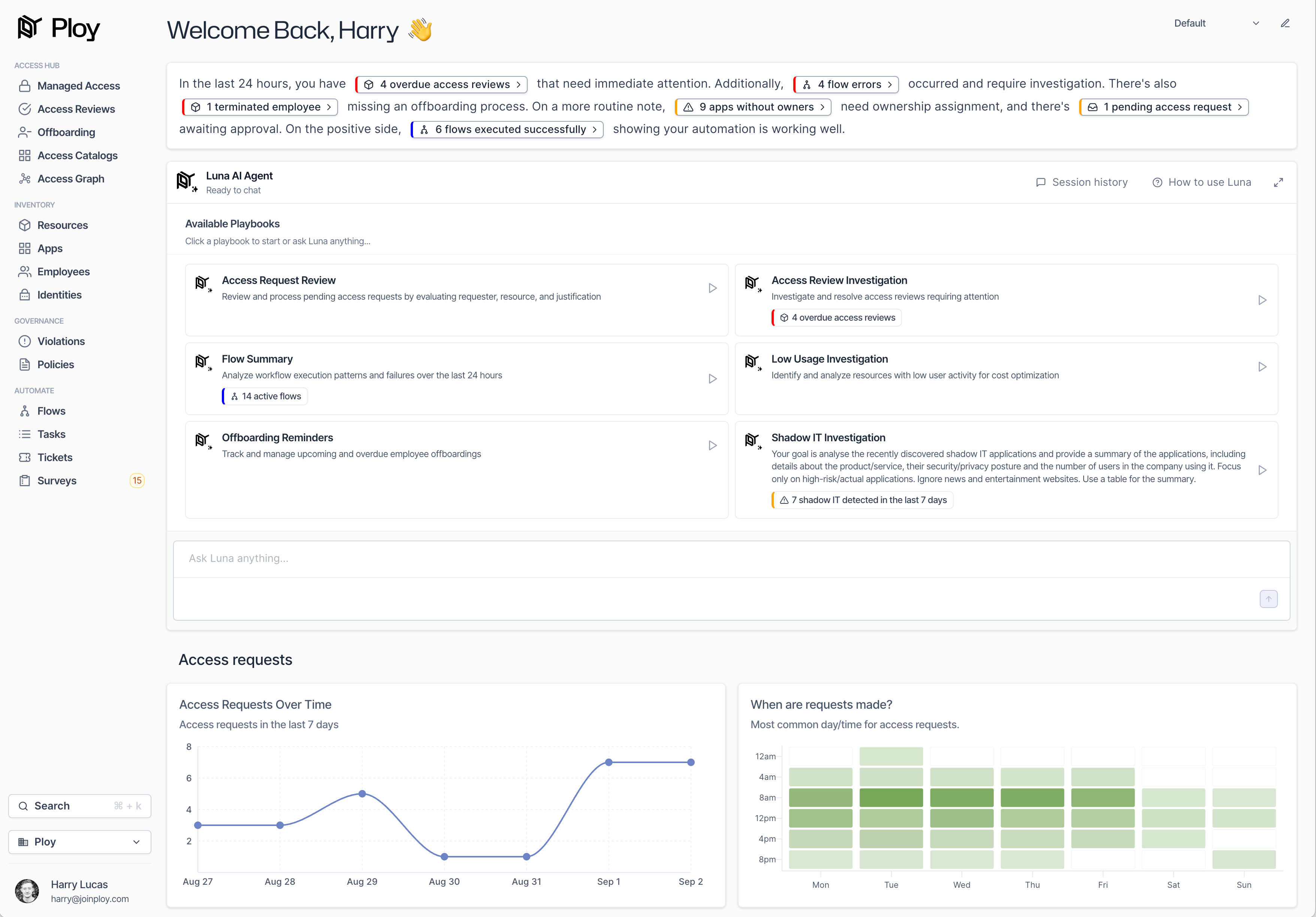 We're super excited to release (in beta) our start/overview page alongside Luna, our Identity and governance AI agent. We believe these will help you get so much more value out of Ploy as well as transform the way you manage identities and access across your organisation.